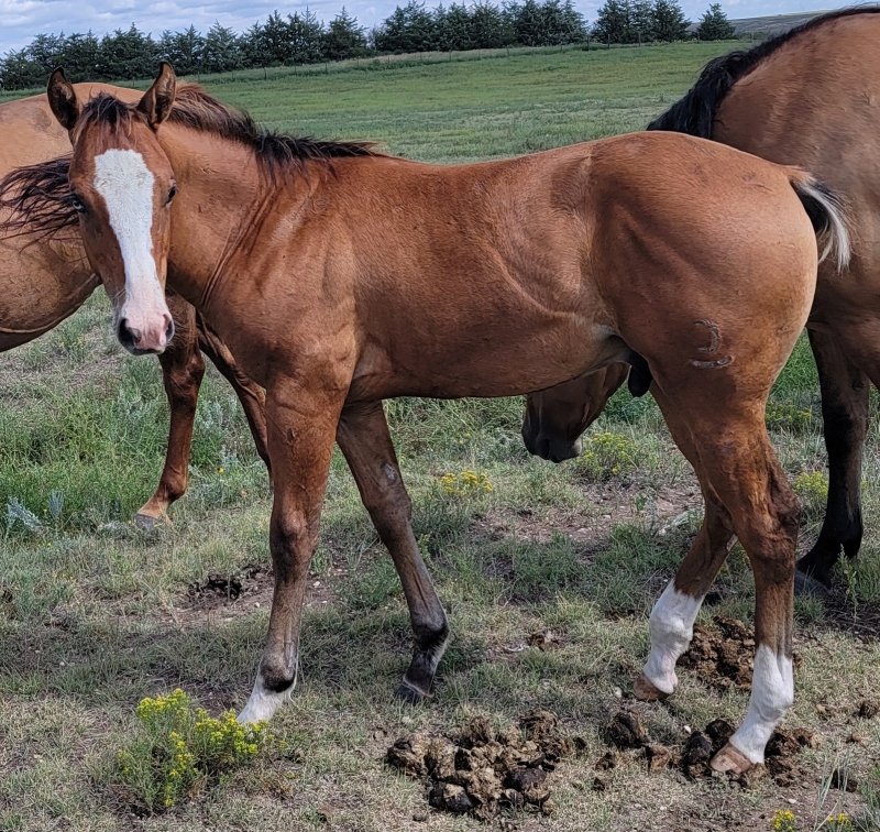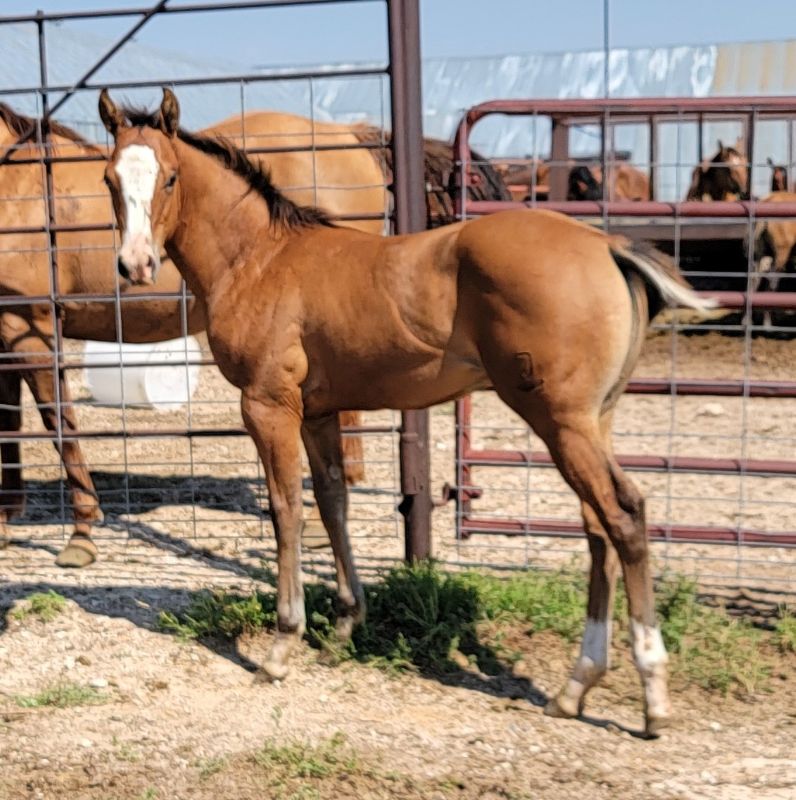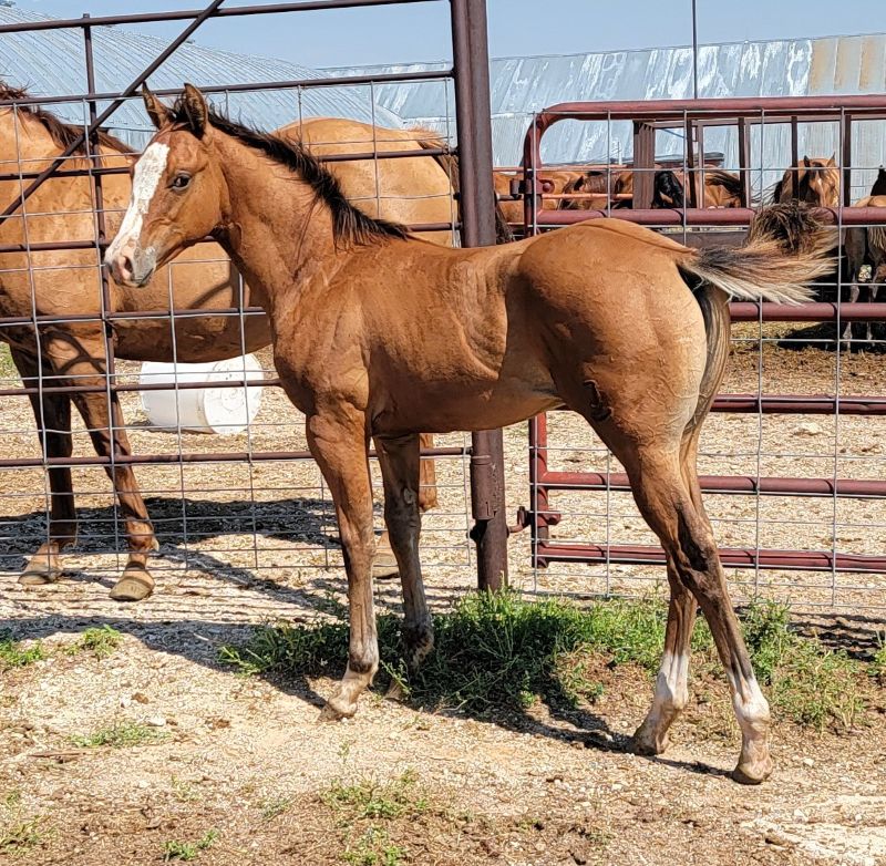 Fancy dun colt born 4-16-2025. Fancy if you like 3 socks, full blaze and 1 blue eye. Out of SJQC Barbee Blanton and by SJQC Rowdy Blanton.Owned by Roger and Jo Timmerman Price: for sale